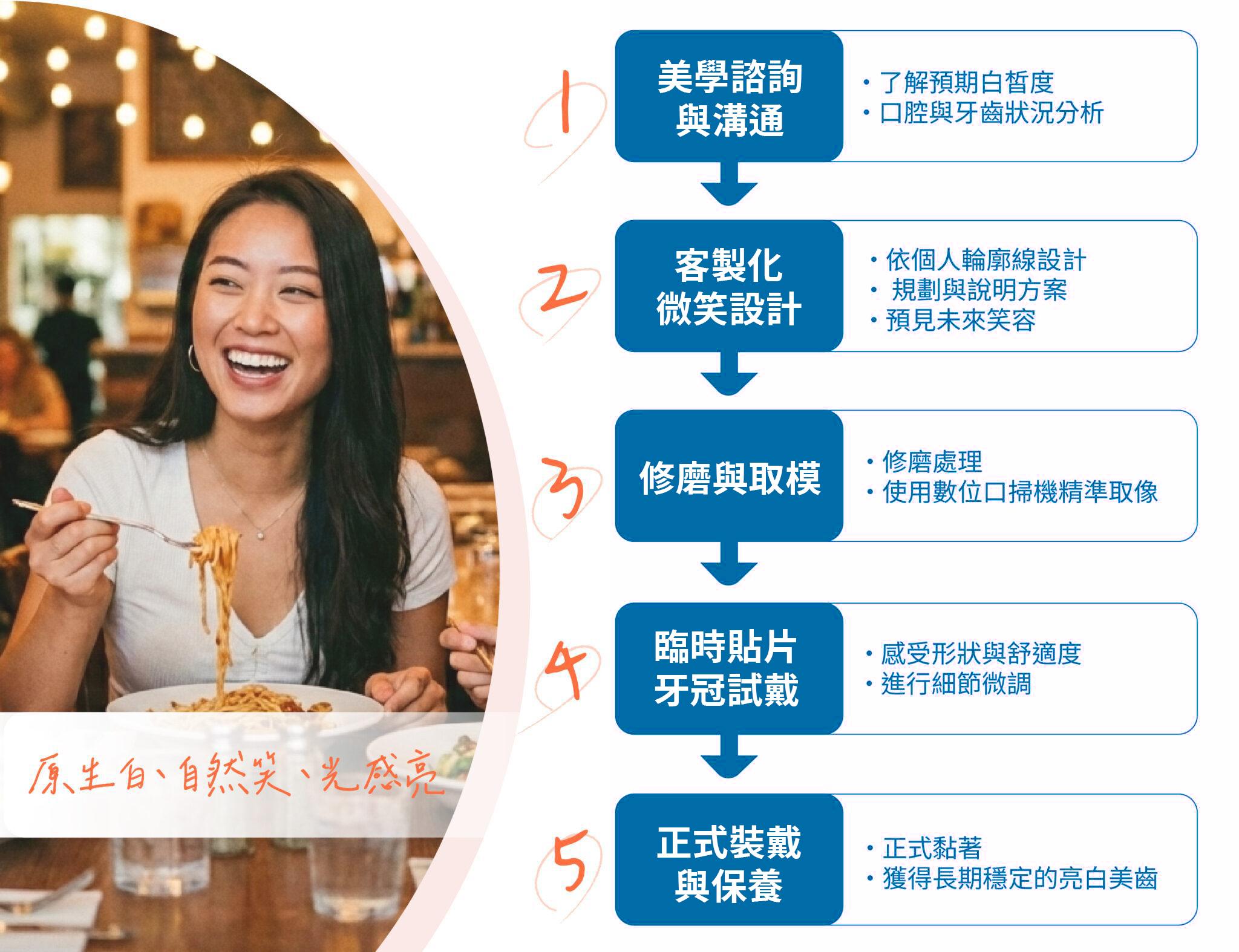✓ 客製化色彩管理:拒絕硬白假牙感,技工師會根據鄰牙層次,堆疊出具備透光感與自然紋理的精緻貼片與冠蓋。