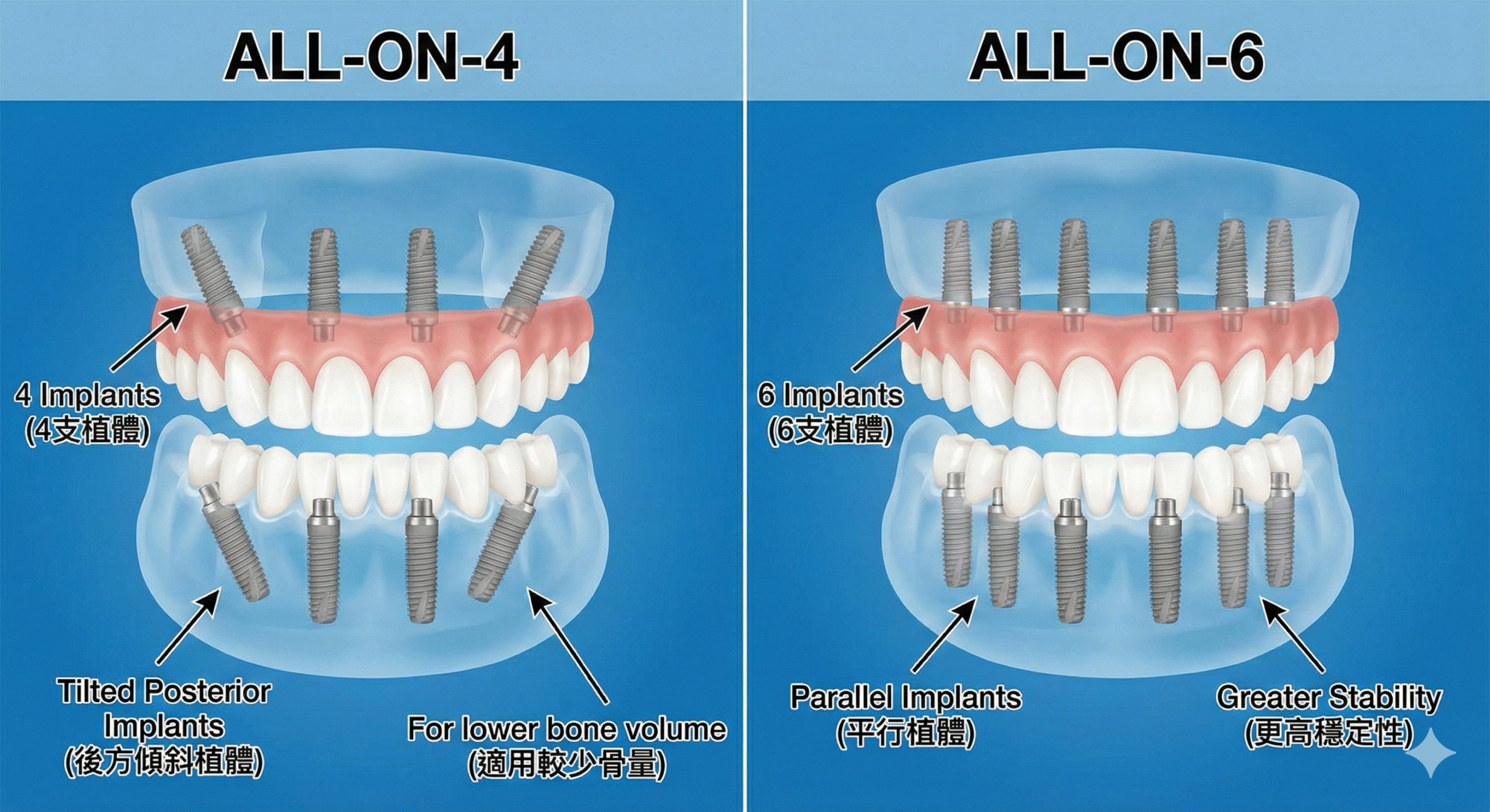 - All-on-6:適合咬合力強/飲食習慣較重的人(如男性或喜歡吃偏硬食物)