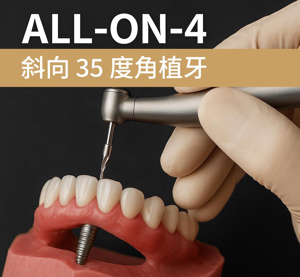 全口重建「黃金35度角」的原理在於,很多人缺牙太久導致後面骨頭萎縮,如果垂直植下去,不是要大費周章補骨,就是會撞到鼻竇或神經管,所以用30到35度角斜植入,利用前面較厚實的骨頭固定,不僅可以減少補骨,手術風險較低,恢復也較快。雖然植體是斜的,就像造橋而橋墩往外斜撐,裝上去後牙齒其實更有支撐力。