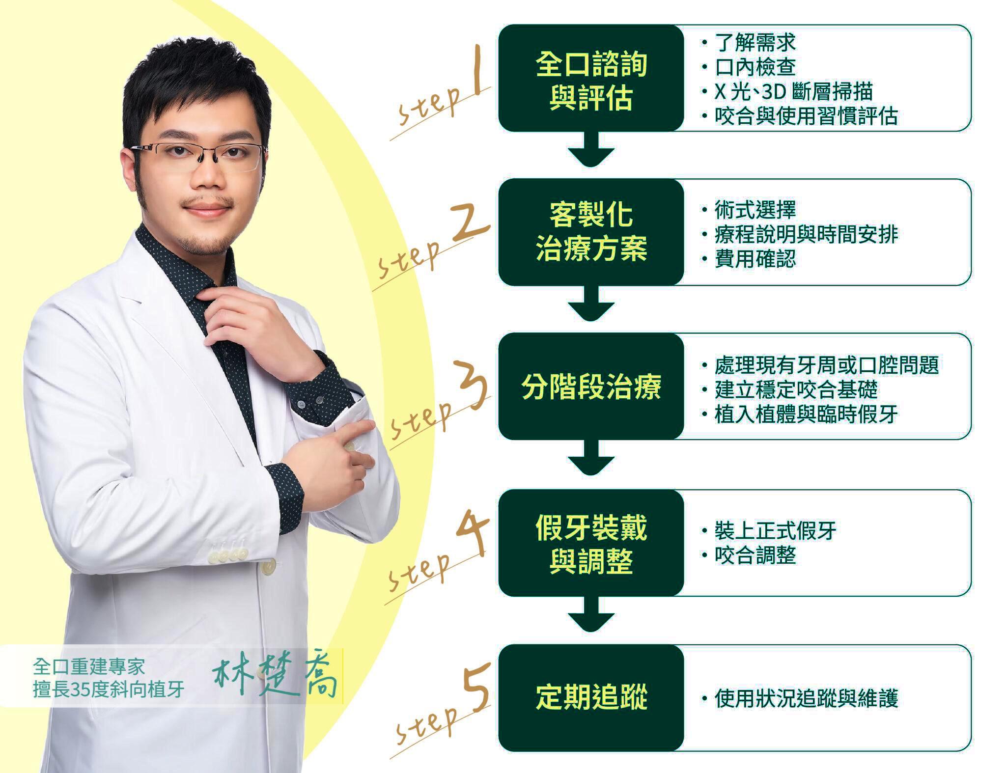 從2015參加哈佛植牙研討會開始,至今走過十多年臨床歷程,林楚喬院長經手數百位重建案例,並持續精進國際最新技術,擁有十數張以上植牙、美學、管理等相關證照。林楚喬院長深耕All on 4及困難植牙領域,同時專精全口重建「黃金35度角」。